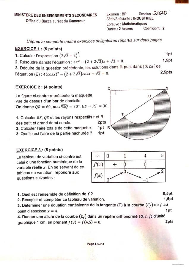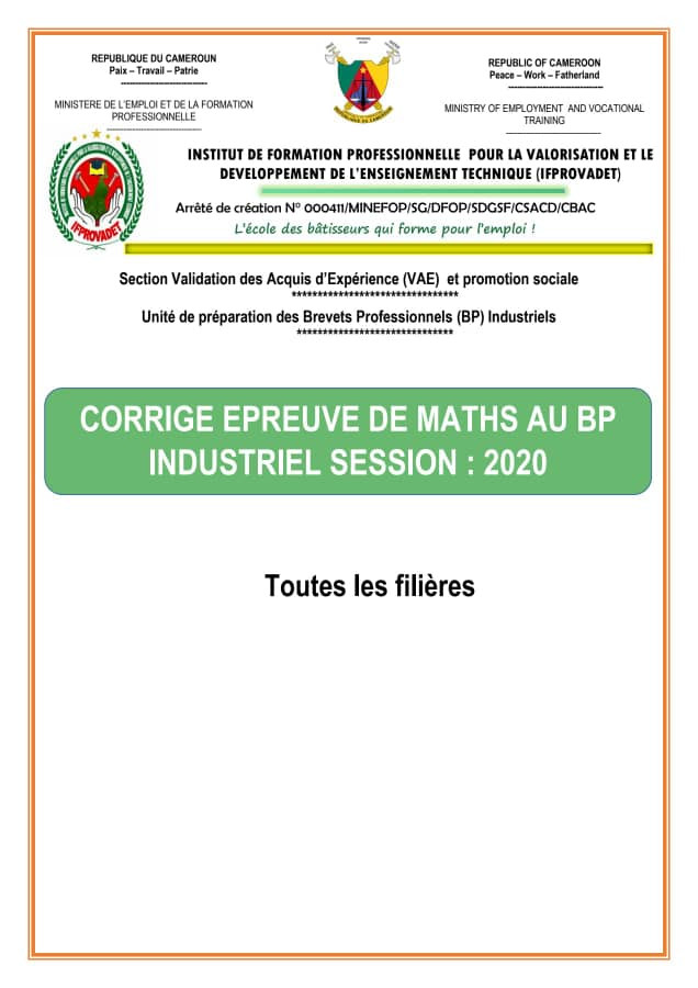 CORRIGE DE L'EPREUVE DE MATHEMATIQUE AU BREVET PROFESSIONNEL INDUSTRIEL SESSION 2020